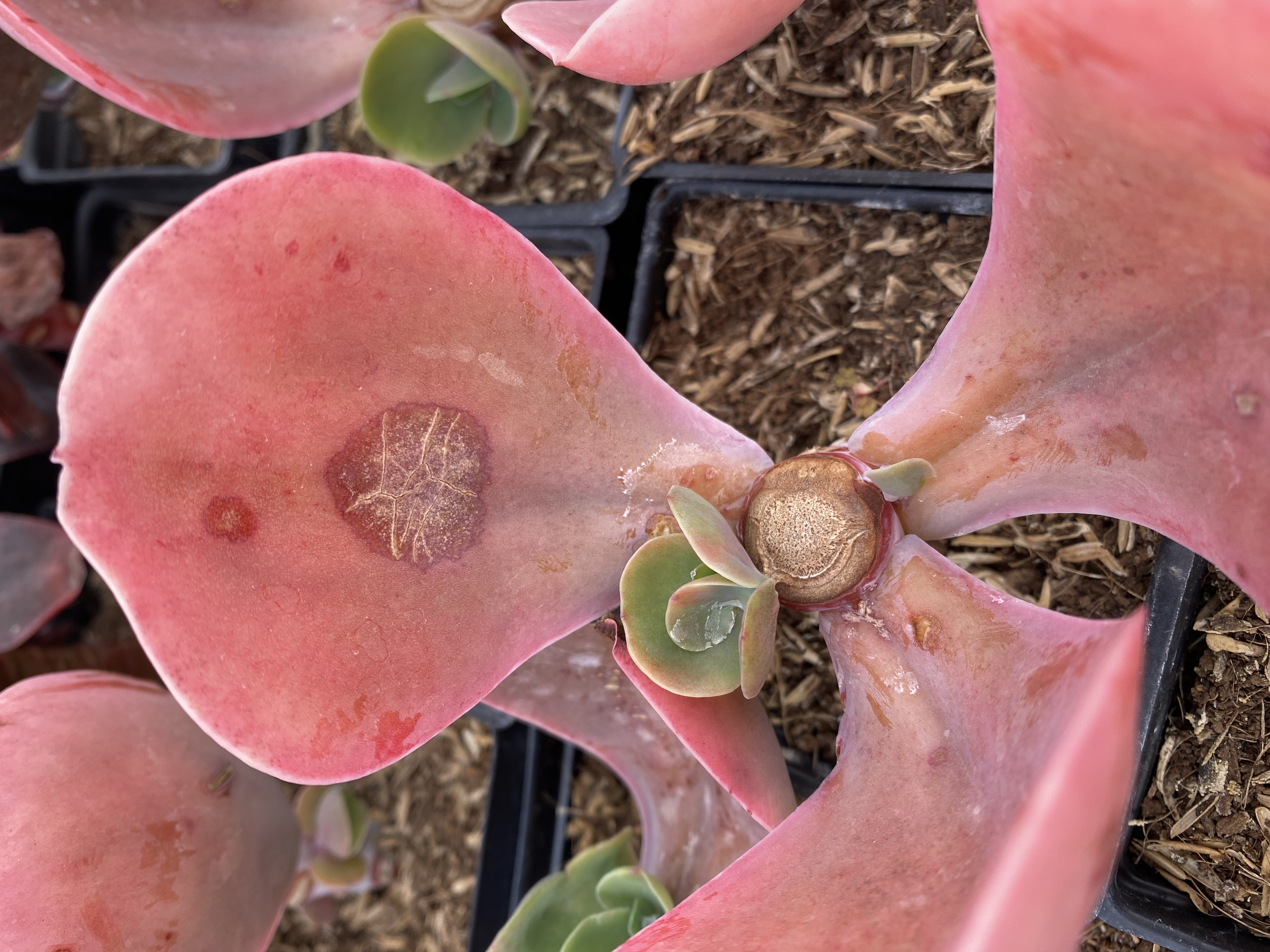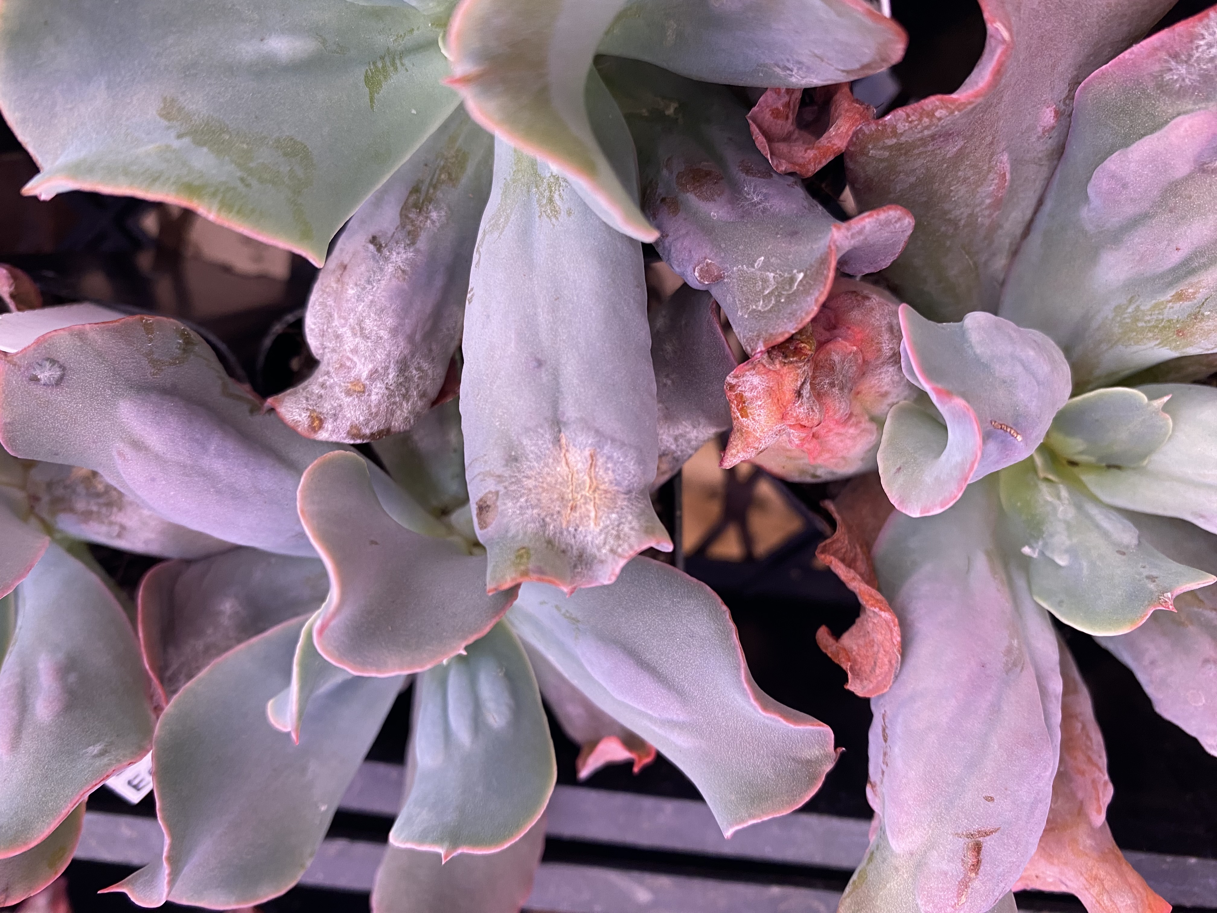 Although powdery mildew is a very common plant disease, it presents atypically on succulents. On succulents, the cracks form first and commonly exist without, or with only very faint powder. It can appear like a bacterial infection in this way.